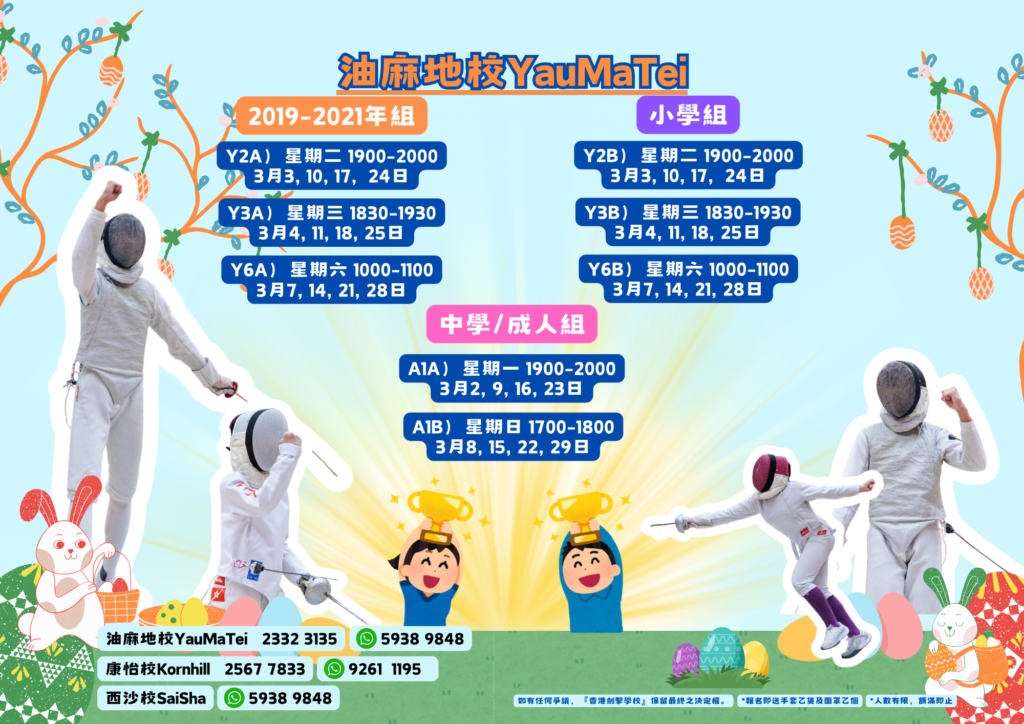 油麻地校 3-4月劍撃證書初班 Fencing Course March – April 優惠費用 $1680/4堂 *報名送手套乙隻及面罩乙隻 (價值$660) *人數有限,額滿即止 報名即按以下表格填寫報名表啦~~或可掃以下QRCODE報名 油麻地校報名表
